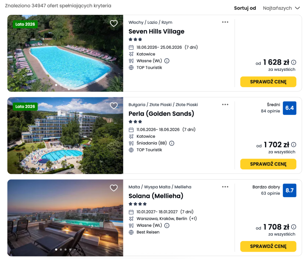 Najprostszym punktem wyjścia są agregatory ofert, czyli strony, które zbierają propozycje różnych biur podróży w jednym miejscu. Dzięki temu możemy szybko porównać ceny, kierunki i hotele bez przechodzenia między kilkoma stronami.